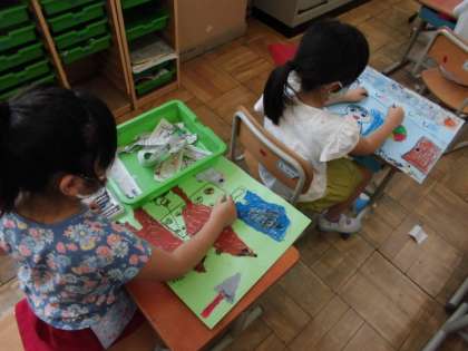 図工の時間には,新聞紙や色画用紙をやぶいてできた形から想像して絵にしました。大きな色画用紙に向きを考えながら貼った紙の周りにクレパスで色を塗りました。すると,だんだん自分のイメージに近づいていました。