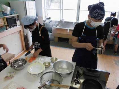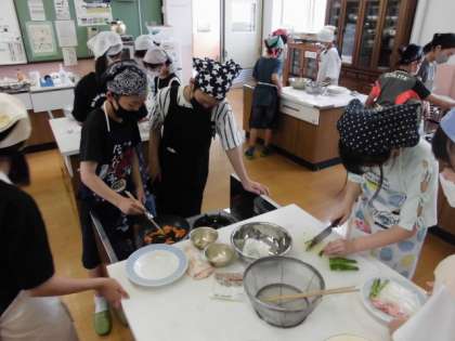 調理実習はみんなで協力できると,積極的に動く姿が増えて楽しくなります。調理だけでなく配膳にも気を配ったり,食器洗いをがんばったりといい雰囲気でできました。実習後の片づけや家庭科室の掃除まで丁寧に取り組んでいました。
