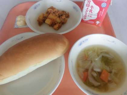 「『豚肉のケチャップ煮』は,豚肉とじゃがいもがケチャップ味でとってもおいしかったです。『野菜のスープ煮』は,いろいろな野菜が入っていて,おいしかったです。」と,感想をくれました。