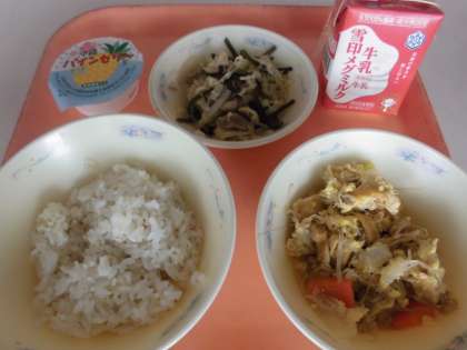 『油揚げのチャンプル』は,にんじん・玉ねぎ・もやしを炒めて,こしょう・しょうゆで調味して,別の釜でけずりぶしでとっただし汁・三温糖・しょうゆの煮汁で煮含めた油揚げを加えて,割りほぐした卵をとき入れて仕上げました。