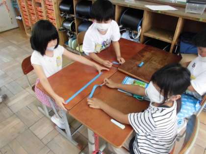 今日の算数では,10cmがどのくらいの長さになるのか調べました。まず,自分が思う10cmの長さで紙テープを切ってみました。その後,自分の切ったテープが10cmなのか,竹尺で測ってみました。思っていたより長かったり短かったりしました。ピッタリの子もいて,とても喜んでいました。