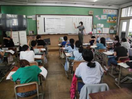 国語では,「見立てる」という教材を使って学習しています。今日は,文章のまとまりごとに要旨をつかむようにしました。気づいたところを発表しながらみんなで考えるようにしました。