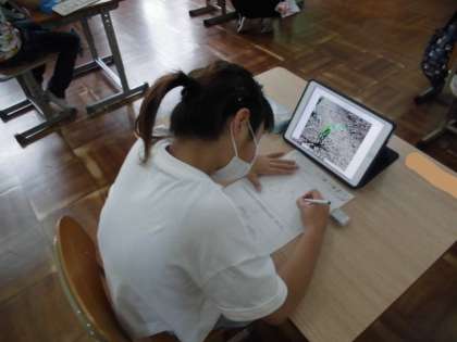 今,クラスの前の畑でポップコーンを育てています。すくすくと成長している様子を写真に撮って観察しました。葉の形や大きさを丁寧に描いた後には色を塗っていました。