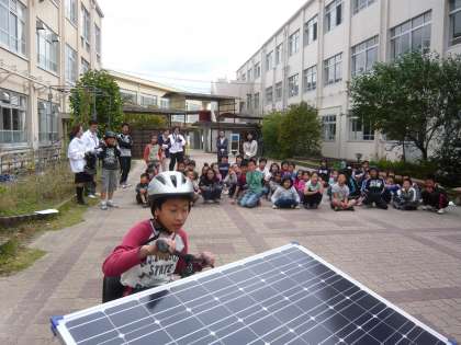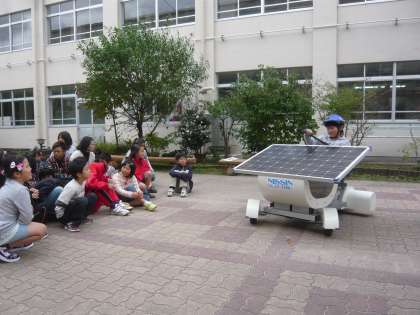 今日は日新電機の方に来ていただきソーラーカーを使って光電池についての学習を行いました。子どもたちは「うわ〜すごい!!動いた〜!!」ととても楽しそうにソーラーカーを運転し,太陽のエネルギーを肌で感じることが出来ました。これからも自然エネルギーを大切にして様々な理科の学習を楽しんでほしいと思います。