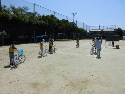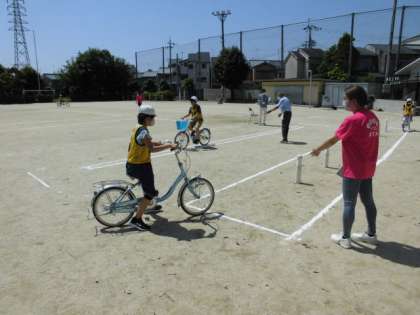 今日は天候にも恵まれ,とてもいい天気の中,自転車教室がありました。運動場にコースを設定し,決められたとおりに走行します。途中,たくさんのポールをよけるところが難しそうでした。これからの安全な生活に活かしてほしいです。