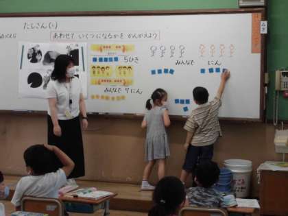 今日の算数では,数図ブロックを使って,合わせたらいくつになるか考えました。ブロックを並べてから合わせるという動作を取り入れるとより分かりやすいようでした。