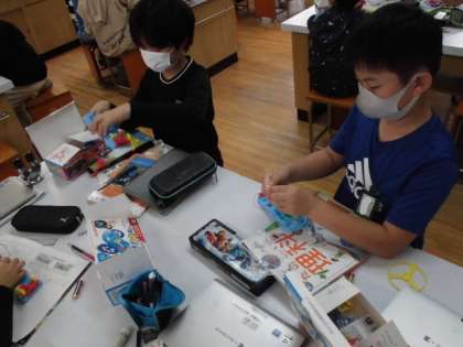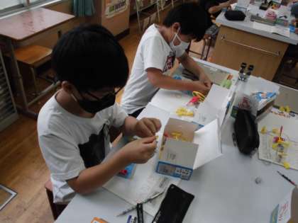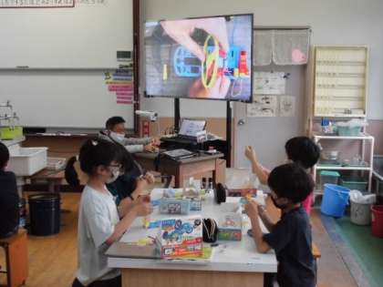 大型テレビに映し出された様子を参考にして,電池と豆電球を導線でつないで回路を作ると電気が流れます。すると,豆電球が光りました。豆電球をモーターに変えると,モーターに電気が流れ,プロペラが回りました。今日の理科では,もっと明るくしたりもっと速く回したりするには,どんなつなぎ方がいいのか実験しました。