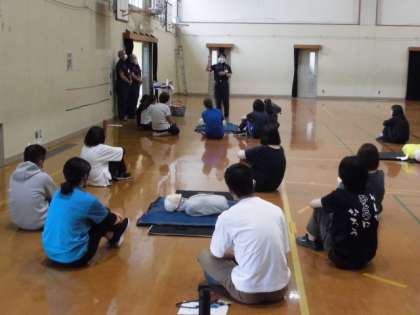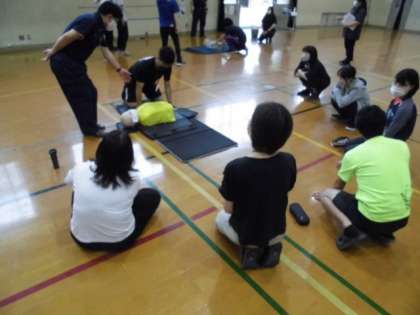 今日は,右京消防署の方に来ていただき,救命救急講習を受けました。体育館に集まり,心肺蘇生法やAEDの使い方,止血した場合の対処などを教えていただきました。日頃より事故防止に努めるとともに,万が一の時にはチームで対応していくことを確認しました。