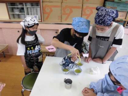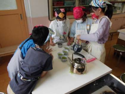 今日の家庭科では,班ごとにお茶を入れました。まずは,グループの人数に合った茶葉や水の分量を量ります。そして,お湯を沸かしたら,少し冷ましてからきゅうすに注ぎました。みんなが同じ分量になるように少しずつ入れてから飲んでみると,思っていたよりもおいしかったようでした。