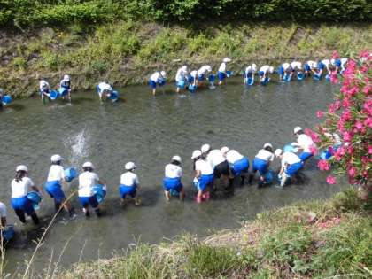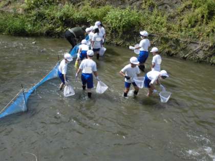 総合的な学習の時間には,学校の北側を流れる有栖川に入って漁業体験を体験をしました。河川で行われる漁業のことを知り,川魚への理解を深めたり河川環境を継承したりすることを目的としています。まず,川魚についてお話を聞いた後,実際に川に入って放流しました。受け取った魚が元気に泳いでいく姿を見た後は,タモや投網で捕まえました。