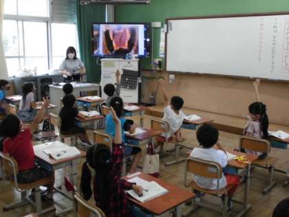 国語では,「くちばし」という教材を使って学習しています。今日は,いろんな動物の口の写真を見て,どんな動物の口か考えました。口の大きさや歯の形などから想像を膨らませ,分かったら「これは〜の口です。」と答えるようにしました。