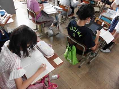 今日の算数では,辺の長さが分数で表されている時,直方体の体積や長方形の面積を求める公式が使えるのか考えました。小数に直して考えると,どうやら使えそうでした。その後,練習問題に挑戦していました。