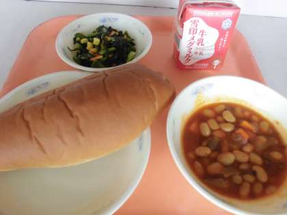 「『大豆と牛肉のトマト煮』は,大豆がやわらかくて,味がしみこんでいて,とってもおいしかったです。『小松菜のソテー』は,コーン・にんじんが甘くて,とってもおいしかったです。」と,感想をくれました。