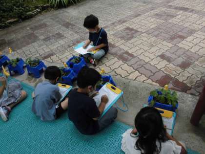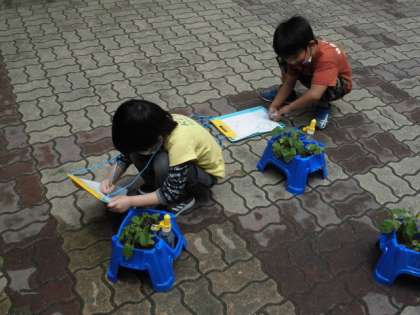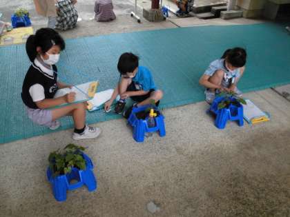 今日は,中庭でアサガオの観察をしました。毎日かかさず水やりなどのお世話をしているので,だんだん大きくなってきているなぁと感じていたようです。観察カードを探検バックにはさんで,中庭に行き,自分のアサガオの鉢を持ってきて観察しました。葉の大きさや数,茎の高さなどをよく見て記録しました。たくさん発芽して葉が多すぎて困っている子もいました。