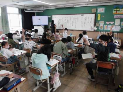 国語では短歌について学習しています。今日は,江戸時代の歌人が作った歌から構成や様子を読み取るようにしました。分かったことについては,積極的に手を挙げて発表していました。