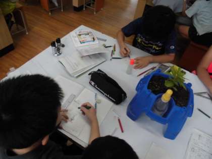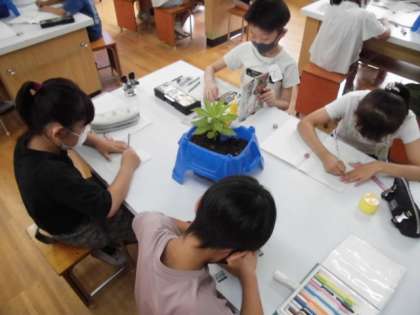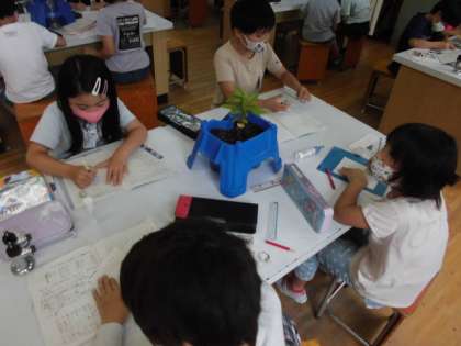 今日の理科では,ホウセンカの観察をしました。ふた葉が出ていた頃から比べると,本葉の数もずいぶん増えました。今日は,葉の形や大きさなど詳しく観察しました。葉の周りがギザギザした感じになっていることに気づいていました。