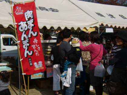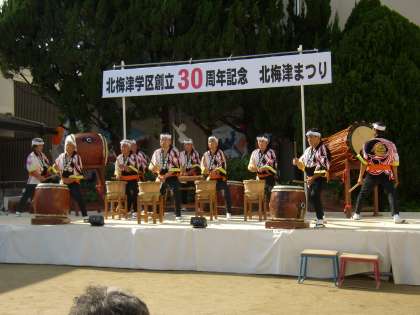 「記念式典」の後,「北梅津まつり」が行われました。ステージイベント会場は,2000人以上の人で大賑わいでした。ステージでは6つの個人・団体による演奏が行われました。運動場には21の模擬店が開かれ,各店の前にたくさんのお客さんが列を作っていました。天気もにも恵まれ,大成功の創立30周年北梅津まつりとなりました。