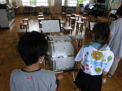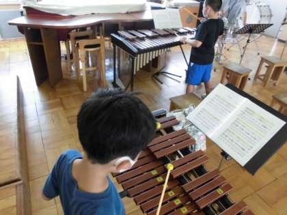 今日の音楽では,「さんぽ」という曲の合奏に取り組みました。木琴や大太鼓,タンバリンなどそれぞれ担当する楽器を決めて練習してきました。今日は全体で合わせてみました。いろんな楽器の音が重なるときれいでした。