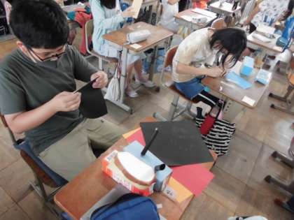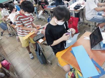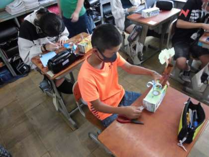 図工の時間には,クランクの仕組みをいかした工作に取り組んでいます。今日は,色画用紙でイルカや太鼓,バスケットボールなどを作りました。土台となる背景部分にも工夫が見られました。