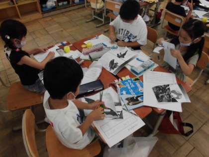 国語の時間には,「くちばし」という教材で学習を進めています。今日は,教科書で学習した問いの文や答えの文を生かして,クイズを作りました。画用紙の表には問題を貼って裏には答えを貼るようにしました。挿絵に色を塗ったりして丁寧に作っていました。