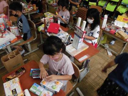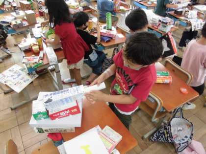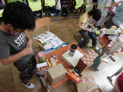お菓子の箱や牛乳パック,ラップの芯などを組み合わせながら想像を膨らませて,自分の作りたいものを作っていました。恐竜や猫,車など思いついたら,早速,取り掛かっていました。