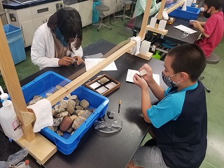 6年生は青少年科学センターへ行って,理科の学習をしています。物理「なみなみならぬ波の科学」と地学「発見!こんなところに石灰岩」に分かれて,普段学校ではできないような実験などに取り組んでいます。地学の学習では,様々な石の中から見た目や硬さ、塩酸反応などから石灰岩を見分けています。