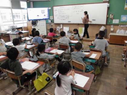 子どもが9人来たので全部で30人になった時,はじめに何人いたのかテープ図を使って考えました。テープ図をかくことにも少しずつ慣れてきたようですが,今日は,□の場所が違います。どこが分からないのか確かめながら図に書き込んでいました。