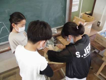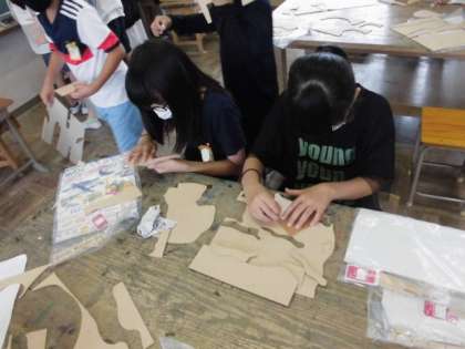 あいにくの雨で水泳ができなくなったので,図工の学習になりました。自分の思いついた線を板に描いたら,電動糸のこを使って切っていきました。しっかりと板を押さえながらゆっくり切るようにしていました。切った後は,紙やすりで磨いていました。