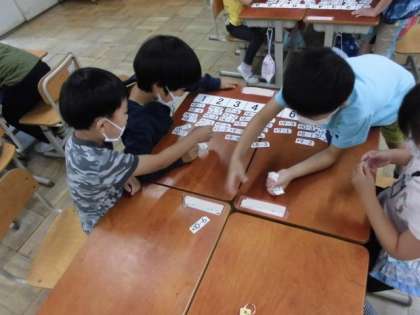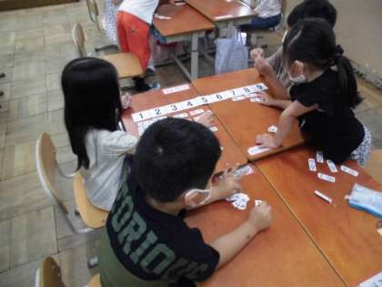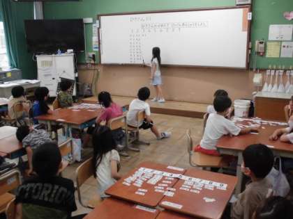 算数では,ひきざんカードを使ってひき算の練習をしました。同じ答えになるひきざんのカードを並べてみると,カードが階段のように並んでいることや規則正しく数字が並んでいることに気づいていました。