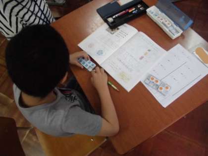 算数の時間には,計算問題に取り組みました。数図ブロックを使いながら繰り上がりの計算にも取り組んでいました。学年が上がると,面積の問題にも取り組んでいました。