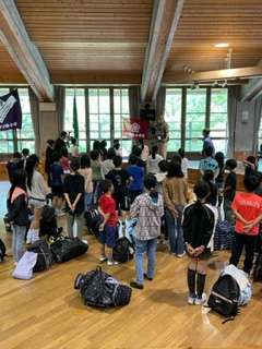 山道を揺られながら山の家に到着しました。小雨が降っているので、オリエンテーションホールで入所式をしました。