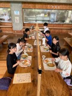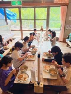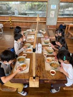 待ちに待ったお昼ごはんです。今日のお昼はうどんがあります。みんな美味しそうに食べています。