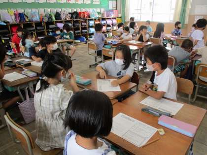 今日は来週の校区たんけんに向けて,たんけんに行く場所のグループで,たんけんのルールやインタビューの仕方を確かめました。グループでインタビューの内容を考え,質問の順番を話し合ったり,インタビューの練習をしたりしました。みんな校区たんけんの日が待ち遠しいようでした。