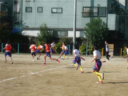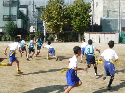 タグラグビー部では,11月12日(土)に京都市立朱雀第一小学校と練習試合を行いました。前半7分・1分ハーフタイム・後半7分の試合を繰り返し,子どもたちは元気いっぱいにグランドをかけまわりました。