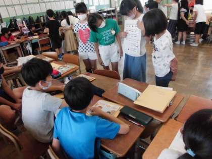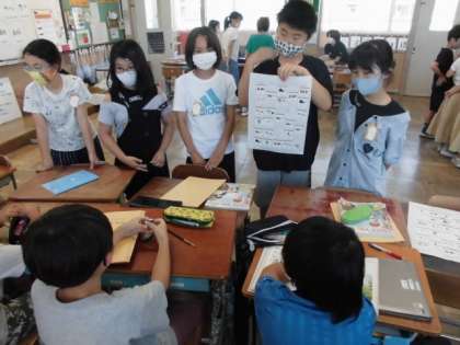 外国語の時間には,自分たちで考えたオリジナル時間割りを紹介し合いました。曜日ごとに担当を決め,自分が学習したい教科を入れていきます。考えて作った時間割を今度は,英語を使って紹介していきます。「I have math and music on Wednesday.」というように伝えた後,好きなことについても質問していました。