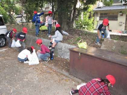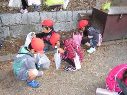 11月15日(火)1年生が北野天満宮に松ぼっくりや落ち葉,ドングリを拾いに行きました。10月下旬,福島市内の小学校からの「松ぼっくりや秋の落ち葉,木の実を送ってください」という願いを受けて,全校児童が集め始めました。集めたものは来週に福島市へ送る予定です。