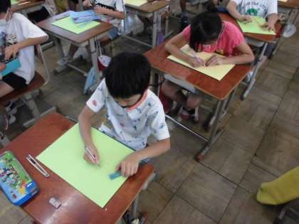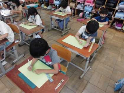 今日の図工は,紙工作です。まず,好きな色の画用紙を選んで窓を作ります。自分の好きな形や大きさが決まったら,鉛筆で下書きをして,窓が開くようにカッターで切りこみを入れました。どんな窓にするかいろいろ考えていました。