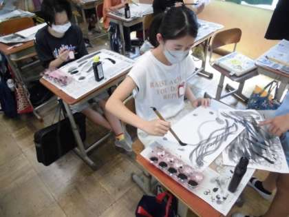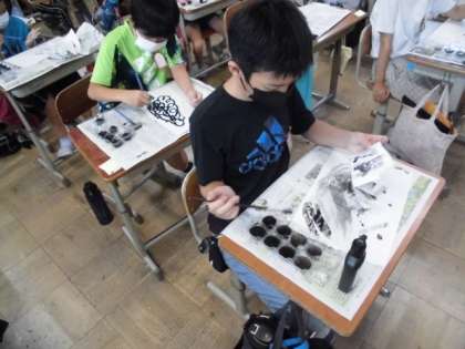 今日の図工では,習字道具を使って,墨の濃淡やにじみを生かした作品をつくりました。いつも書写の時間で使うのとは少し違い,水の量を加減して濃淡をつけたり筆を回してみたりしました。まずは,どんな感じになるのかいろいろ試していました。