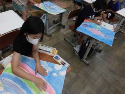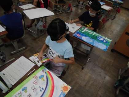 今日の図工では,自分が想像した6月の様子を絵に表しました。下絵をもとに絵の具やクレパスを使って色を塗っていきました。背景には,コンテも使いながら色合いを工夫していました。完成したら,自分の絵についてがんばったところや工夫したところを書いていました。