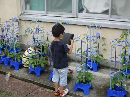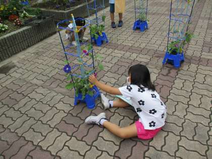 毎日水やりを続けてきたアサガオもかなり成長し,花をつけているものも増えてきました。今日は自分の育てているアサガオさんの様子をタブレットで写真に撮ったり,絵や文で観察したことを記録したりしました。花が咲いて,みんな大喜び。じっくり観察していました。