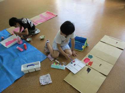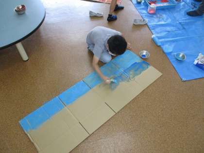 段ボールを立てたり、開いたりしながら、自分の作りたいものをを形づくっていきます。今日は段ボールにローラーやハケで、自分の作りたいものに合う色を塗っていきました。絵具を混ぜて「こんな色ができたよ」と嬉しそうに言ったり、ローラーで塗る感覚を楽しんだりしていました。どんな作品が出来上がるか楽しみです。