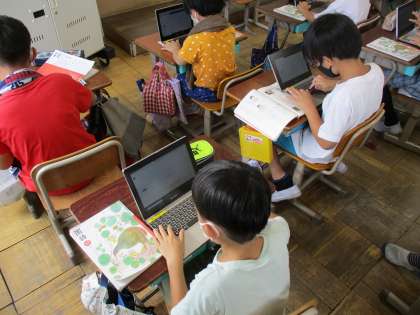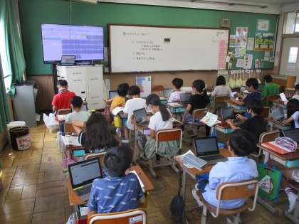 新聞を作っていく中で、アンケートをして調べた記事を載せます。アンケートをするのに、GIGA端末を使ってアンケートフォームをつくりました。初めての作業でしたが,互いに教えあいながら作り上げていました。「みんな答えてくれるかな」とアンケートをするのが楽しみな4年生でした。