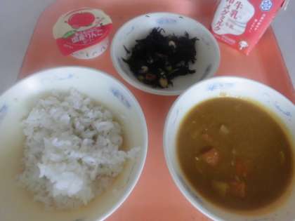 「『チキンカレー』は,野菜がやわらかくて,カレーの味がとってもおいしかったです。『ひじきのソテー』は,豆がたくさん入っていて,おいしかったです。」と,感想をくれました。