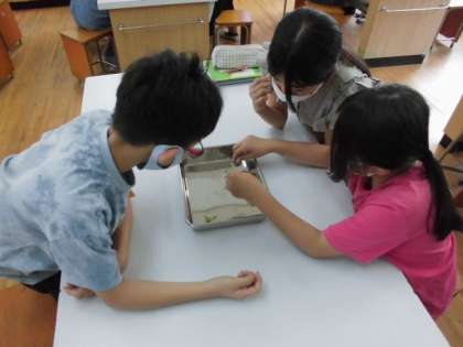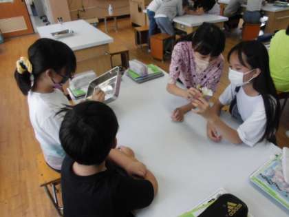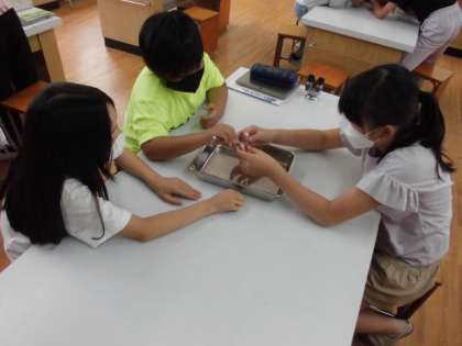 暑い中ですが,中庭には,いろんな花が咲いています。色も種類もいくつかあってとても明るい雰囲気となっています。そんな花のつくりはどうなっているのか,花を分解して観察しました。周りには花びらがあり,中を見ると細いものが何本かあります。形の違うものもあるようで,それぞれが何と呼ばれているのか学習しました。