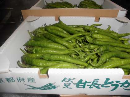 『伏見とうがらしのおかか煮』「伏見とうがらし」は,京野菜の一つです。京都の伏見地区で昔から作られてきた「甘長とうがらし」のことで,京都府内で育てられているものだけを『伏見とうがらし』と呼ばれています。細長い形と,から味が少ないのが特徴です。今日の給食では,だし昆布でとった出し汁みりん・しょうゆでつきこんにゃく・ちくわ・伏見とうがらしを加えて煮,花かつおを加えて仕上げました。