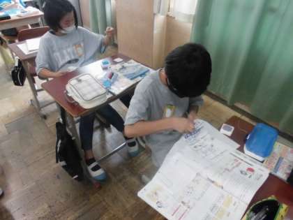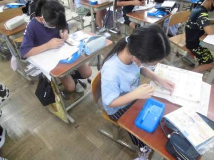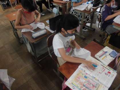 今日の家庭科では,さいほう道具を使って,玉結びや玉止めの練習をしました。針と糸を使って縫っていく時,糸が抜けないように玉を作らないといけません。教科書の挿絵や動画を見てやり方が分かったら,早速,やってみました。細かい作業なので,集中力と根気が必要ですが,みんながんばっていました。