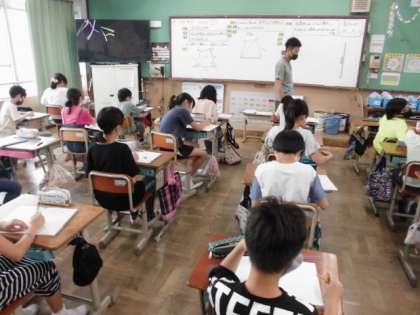 算数では、合同な図形の描き方について学習しています。今日は、三角形の描き方を学習したことを生かして四角形を描く方法を考えました。ぴったり重なることが大切なので、コンパスや定規など正確に使って描くようにしていました。