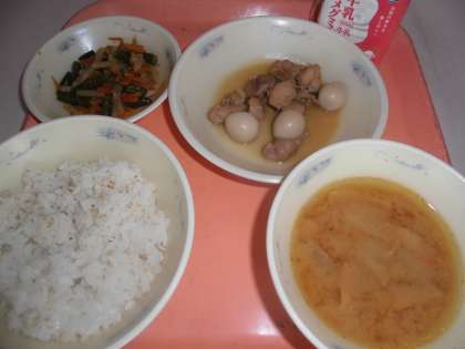 「『鶏肉のさっぱり煮』は,うずら卵に味がしみこんでいて,とってもおいしかったです。『野菜のきんぴら』は,いろどりもきれいで,色々な歯ごたえがあっておいしかったです。『いものこ汁』は,里いもがやわらかくて,おいしかったです。」と,感想をくれました。
