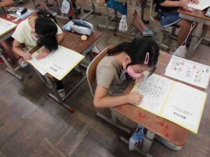 今日の外国語活動では、相手に自分の好みを紹介する言い方を学習しました。プリントに自分の好きなものが書けたら、英語を使って伝えます。自分の好きなものを「I like 〜」とたくさん紹介していました。学習の最後には、今日の活動を振り返ってできたことを記録していました。