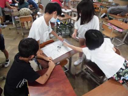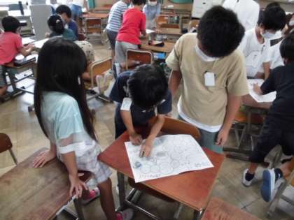今日は2学期の初日ということもあって、みんなですごろくをしました。サイコロをふって出た目の数だけ進めます。止まったマスを見ると、いろんなお題が書かれていました。お話をしたりジャンケンをしたりして楽しい時間を過ごしていました。